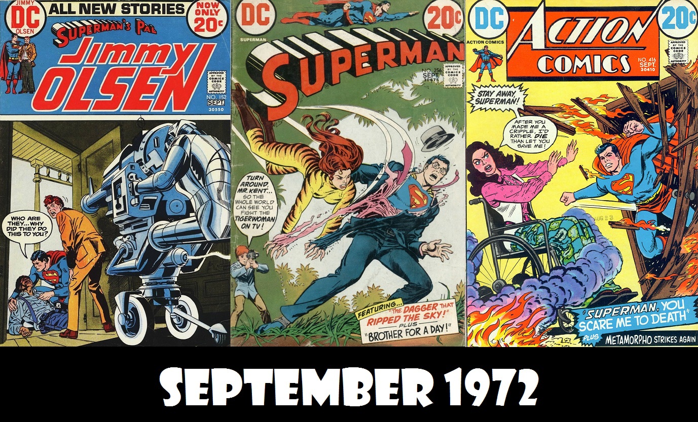 According to my watch, it’s time for another thrilling episode of Superman in the Bronze Age.  This time, we have a somewhat controversial ending to the Morgan Edge Clone Saga (no hoodies here, just hoods), Superman fights a Transformer more than a decade before they were cool, then puts a bunch of people in danger.  Next, he scares a crippled girl enough that she is able to walk and, in the Action backup, Metamorpho does his part for world peace.  Plus, ads and Elsewhere in the DC Multiverse.